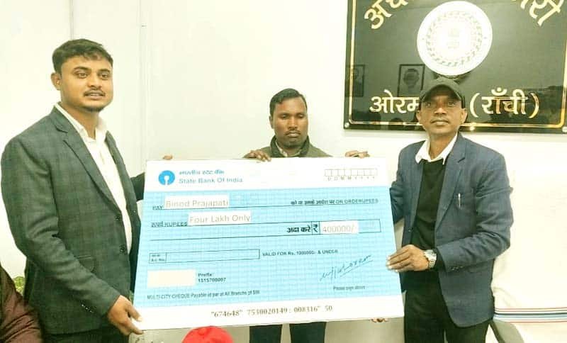 ओरमांझी (रांची दर्पण)। ओरमांझी प्रखंड क्षेत्र के सदमा पंचायत अंतर्गत होचाई में पिछले 6 महीना पहले रात के सन्नाटे में बिस्तर में सो रही 30 वर्षीय महिला शांति देवी की मौत सांप के काटने से हो गयी थी। पति बिनोद प्रजापति और परिजनों द्वारा अथक प्रयास के बाद कागजी कार्रवाई के उपरांत झारखंड सरकार के आपदा राहत कोष द्वारा ओरमांझी अंचल अधिकारी उज्जवज सोरेन के हाथों मृतक महिला के पति विनोद प्रजापति को अंचल कार्यालय में वित्तीय सहायता के रूप में 4 लाख का मुआवजा राशि मिला।