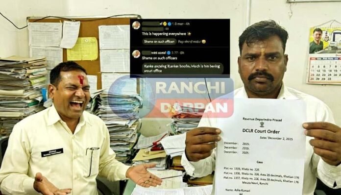 कांके अंचल के राजस्व कर्मचारी ने डीसीएलआर कोर्ट के लिखित आदेश को लात मारकर कहा – ‘फाइल कहाँ है? पता नहीं!’ सुनिए वो बेशर्म ऑडियो जो रांची की नौकरशाही को नंगा कर रहा है….!