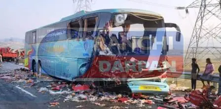 बस और ट्रक के बीच हुई आमने-सामने की टक्कर में दोनों वाहनों के चालकों की मौत हो गयी। टक्कर इतनी जोरदार थी कि दोनों वाहनों के परखच्चे उड़ गये।